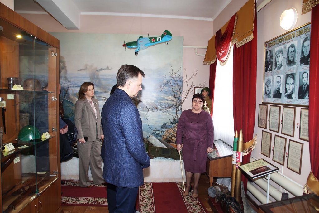 В историко-краеведческом музее, который ежегодно посещают около 6 тысяч человек, Юрий Слюсарь осмотрел постоянные экспозиции и новый раздел, посвященный участникам специальной военной операции. Директор музея Ирина Вербицкая рассказала об героях района времен Великой Отечественной войны.