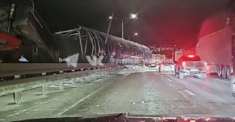 Вечером 18 января на трассе М-4 «Дон» в Каменском районе произошло серьёзное ДТП — самосвал с поднятым кузовом врезался в пешеходный мост.