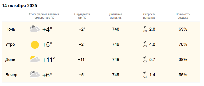 Главная » #ПОГОДА » Прогноз погоды в Чертково на 14 октября 2025 Прогноз погоды в Чертково на 14 октября 2025 На чтение мин Просмотров 64 Опубликовано 14.10.2025 04:55