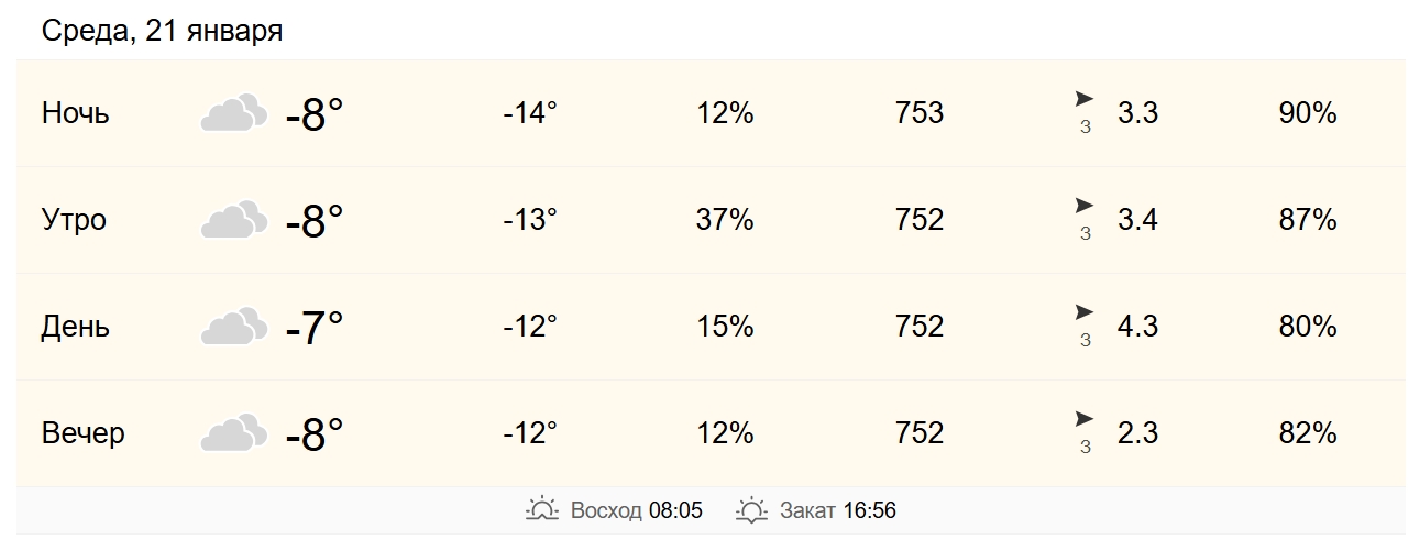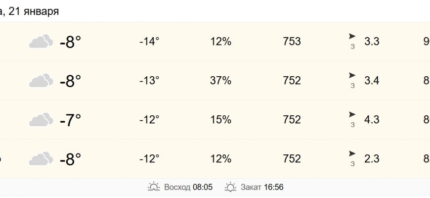 К вечеру похолодает ещё немного. Фактическая температура опустится до -8°C, а с учётом влажности в 84% будет ощущаться как -12°C. Давление останется стабильным (748 мм рт. ст.). Таким образом, на протяжении всего дня и вечера будет сохраняться характер сырого, пронизывающего холода, который особенно коварен.