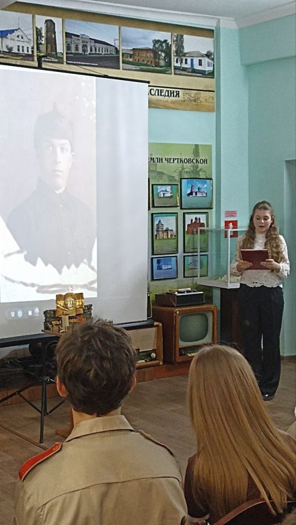Ученица Чертковской СОШ №3 Солоп Варвара рассказала историю своих предков, участников Великой Отечественной войны. Также гостем нашего мероприятия стал Борисов Р. Ю., который рассказал о поисковой работе в своей юности, а именно в 17-летнем возрасте стал участником раскопок. Ученица МБОУ Шептуховской СОШ Кравцовой Анастасия, участница отряда рассказала о работе отряда по памятнику, который находится в селе Шептуховка.