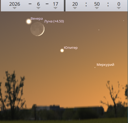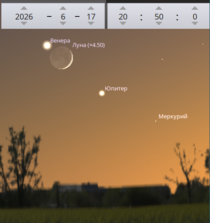 А 16 и 17 июня к этой планетной троице присоединится тонкий лунный серп, очень красиво дополняя небесную картину. Для наблюдения потребуется место с чистым западным горизонтом, без домов и деревьев.